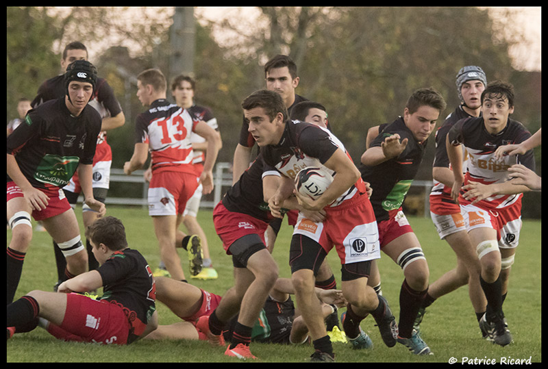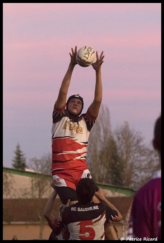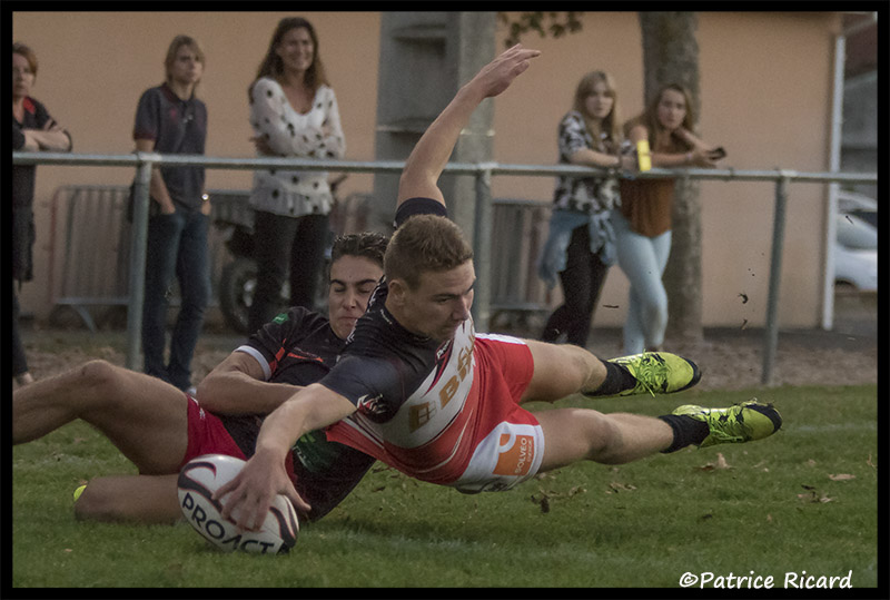 RC SAUDRUNE : 2 essais de Oscar AÜLLO (19′) – Thomas MELAC (57′) – 3 pénalités (10′-42′ et 47′) et une transformation (19′) de Oscar AÜLLO.
