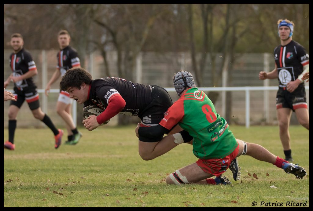 Chaque équipe aura sa mi-temps. La Saudrune rentre dans la partie tambour battant. Ça plaque à tout va. Nos deux centres tel que des bûcherons canadiens, découpent tout ce qui se présente. Coach yannick me fait remarquer, que les bouchers savent aussi très bien découper et il sait de quoi il parle.  Même notre 9 se jette dans la bataille et semble prendre un certain plaisir d’aller « au farnac ». Les Saint sulpiciens sont au supplice. Ils reculent alors qu’ils sont à l’attaque. Ils commettent des fautes et notre 10, Nathan ouvrira le score sur une pénalité à la 13 ième minute. Un instant après captain Max, ira à l’essai bien servi par Dylan. Tel un cheval fougueux inatteignable, il ira aplatir au pied des poteaux, rendant comme une simple formalité la transformation. 10 à 0. Saint Sulpice subit et se heurte à une défense inébranlable. Il faut engranger des points car nous avons l’avantage de jouer avec le vent. Une pénalité plutôt dans les cordes de notre 10, ne sera pas passer de peu. Sacré vent fripon à faire soulever un jupon comme le chante si bien Brassens. Il sera aussi dommage, par excés de gourmandise de ne pas avoir su négocier un 4 contre 1, synonyme d’essai à coût sûr. D’autant que depuis la 35ème St Sul joue à 14 après avoir écopé d’un rouge sur une brutalité.