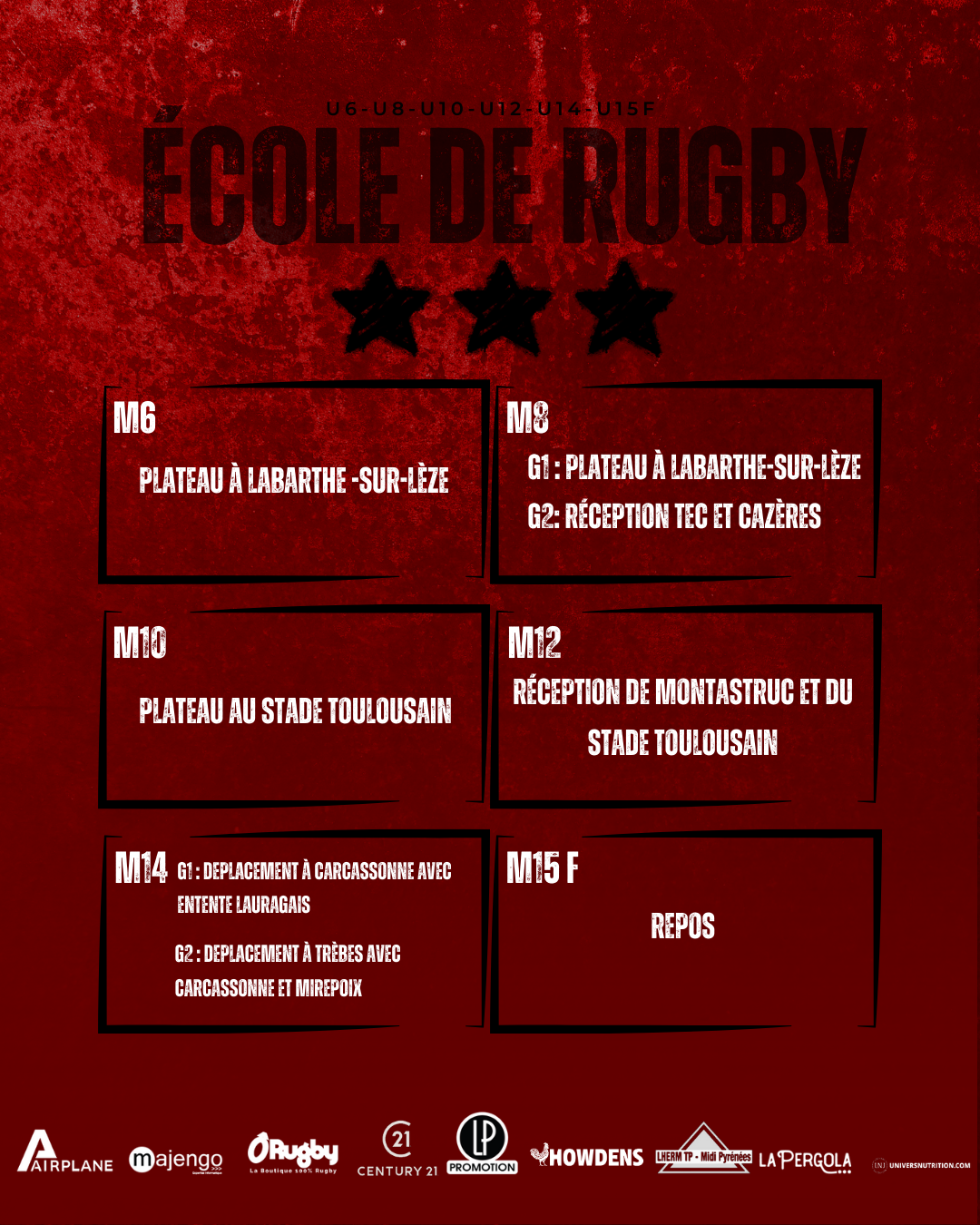 Les plus jeunes auront l’occasion de représenter le club sur plusieurs terrains. Les M6 et M8 (G1) se rendront à Labarthe-sur-Lèze, tandis que les M10 participeront à un plateau au Stade Toulousain. Les M8 (G2) recevront TEC et Cazères, alors que les M12 accueilleront Montastruc et le Stade Toulousain. Du côté des M14, deux déplacements sont prévus : un à Carcassonne avec l’Entente Lauragais et un autre à Trèbes, accompagné de Carcassonne et Mirepoix. Enfin, les M15 féminines bénéficieront d’un week-end de repos.
