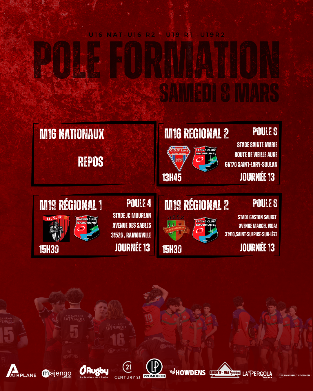 Chez les jeunes, les M16 Nationaux profiteront d’un repos bien mérité. En revanche, les M16 Régionaux 2 se déplaceront à Saint-Lary-Soulan pour affronter le COS Luy. Les M19 Régionaux 1 seront en déplacement à Ramonville pour y affronter l’USR, tandis que les M19 Régionaux 2 se rendront à Saint-Sulpice-sur-Lèze pour défier l’USSS.