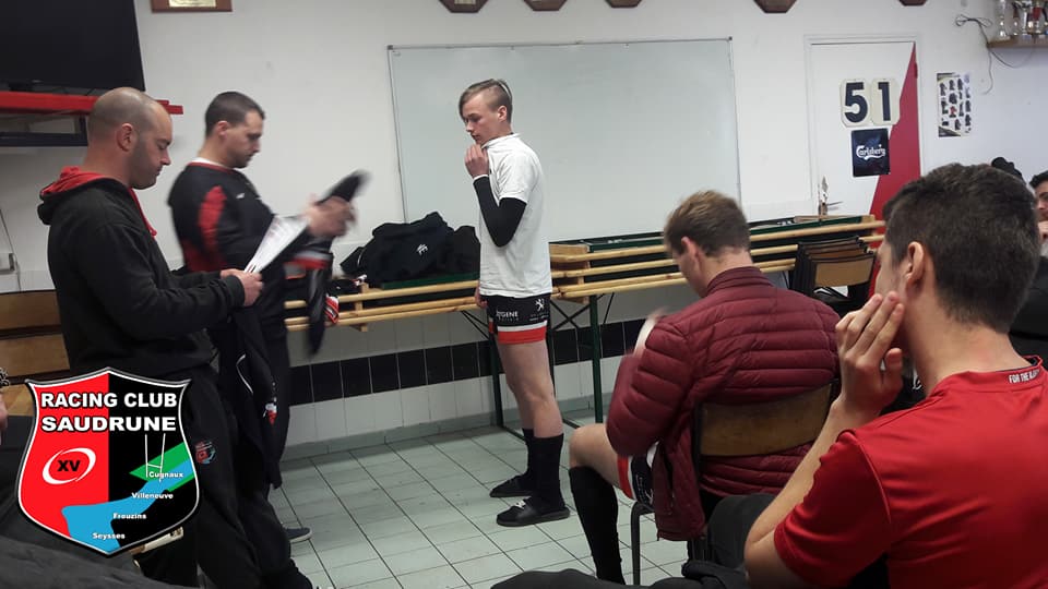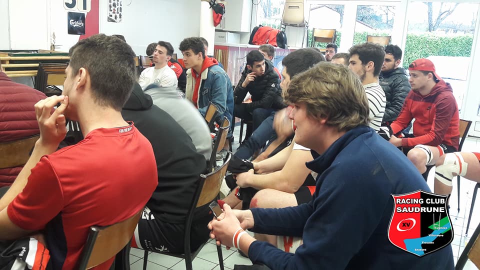 Le coup de sifflet va libérer les 22 acteurs. Mais ici pas de place pour le cinéma. Les bleus et noirs veulent rapidement marquer leur territoire, ils sont chez eux. Encore que les tribunes sont bien garnies de supporters du RC Saudrune et en particulier des juniors vainqueurs de leur match, qui sont venus supporter leurs jeunes ainés. Les premiers contacts sont rudes, comme si l’adversaire voulait nous marquer au fer. Mais au RC SAUDRUNE, aujourd’hui, on est déterminé. On se souvient qu’au match aller, c’est sur une faute non sifflée que Tournefeuille nous avait battu. Mais pas de place pour les regrets. Nos garçons sont très actifs, ils relèvent le défi physique imposé par l’adversaire. Chacun a hissé sont niveau de jeu. Nous sommes présents sur les rucks, sur les soutiens, ça plaque à tour de bras, en touche on est également actifs sur les contres. Tournefeuille est surpris par notre engagement et commence à y perdre son latin. « NON PROGREDI EST REGREDI » (qui n’avance pas recule). La possession du terrain est largement à notre faveur. Sur le banc, les coachs sont satisfaits de ce début de match, mais une question se pose : «Vont-ils pouvoir tenir tout le match ». A chaque arrêt de jeu on s’encourage. Les coachs depuis le banc continuent à donner leurs consignes. Aujourd’hui, personne ne se plaint de blessures. Finalement le score se débloquera pour les deux équipes par des pénalités. Nathan, notre buteur, malgré une douleur à la hanche contractée la semaine dernière, tient sa place et ajustera deux pénalités. Deux autres pénalités qui nous auraient permis de faire un break ne seront pas passées. (P…… d’os iliaque) ; quand à Tournefeuille ils répondront par une pénalité. 6 à 3 en notre faveur. Le score est serré. C’est chaud. Tournefeuille tentera bien quelques petites chamailleries pour nous faire sortir du match, mais nos garçons ne tomberont pas dans le piège tendu et sauront faire preuve de sang froid. La fin du match approche, tout peut basculer. Tournefeuille lance ses dernières forces dans la bataille, mais nos garçons arc-bouter, ne lâcheront rien. La fin de match est insoutenable. La question la plus entendue est : Il reste combien ? ». Le chrono, dans de tel moment, ne défile pas assez vite. Notre équipe tient le match, mais tout peut aller très vite. Un placage manqué, une faute…Et là, quand tu entends le coup de sifflet final et l’arbitre qui lève son bras et qui montre le vestiaire, tu as compris que c’est gagné. C’est l’explosion de joie. On se congratule. Il y a de l’émotion palpable chez les joueurs, comme chez les coachs et l’encadrement. Les supporters sont ravis. Ce match, il s’est gagné avec les tripes. Les 21 joueurs sont à féliciter et peuvent être fiers d’eux. Même si les conditions de jeu ont fait que tous les remplaçants n’ont pas pu jouer, cette victoire, c’est celle d’un groupe de copains, d’un groupe qui a de l’avenir.