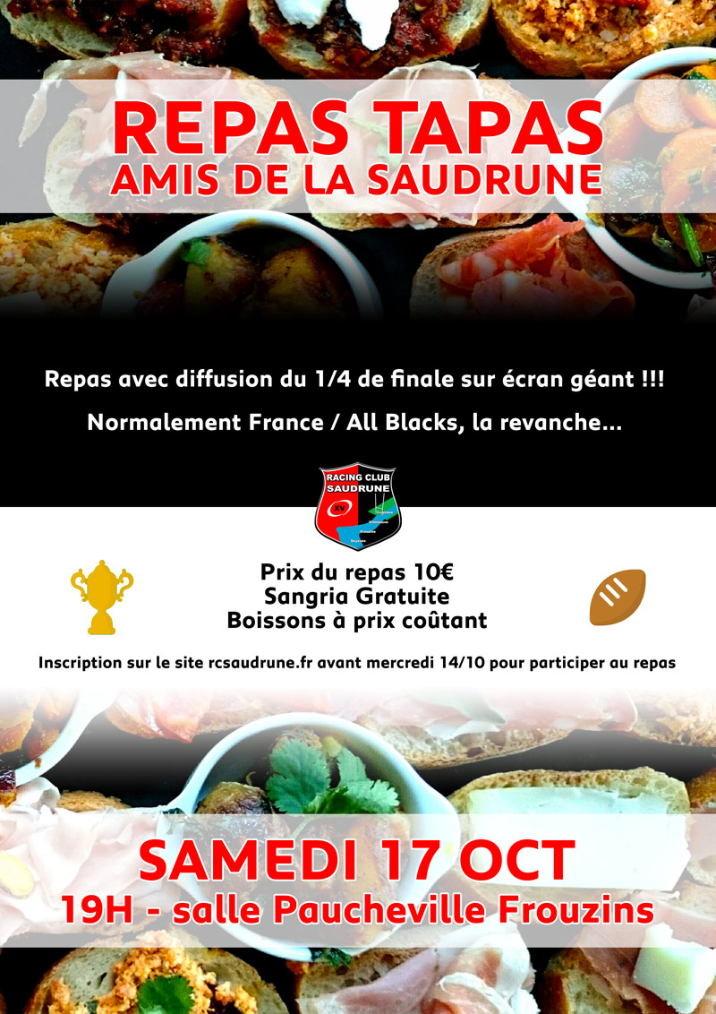 Ce samedi 17/10 à 19h, les Amis de la Saudrune organisent un repas TAPAS à la salle Paucheville à Frouzins.